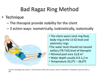 Knupfer utilized three floatation rings to help keep a client in a supportive horizontal supine position or even prone with floatation. - Bad Ragaz Ring method Developed in 1930s in Bad Ragaz Switzerland Stabilization active resistive exercises Client supine with rings around pelvis neck and ankles - Halliwick method Pre-swim for disabled people aquatic physics leads to neuromuscular smooth movements - WATSU or Water Shiastsu. Clinical Ai Chi by Anne Bommer and Johan.